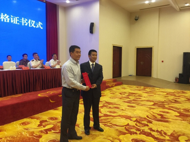 聯(lián)合驗收組組長、海關(guān)總署加貿(mào)司李志輝副司長向昆明綜合保稅區(qū)管委會專職副主任張宏頒發(fā)合格證書