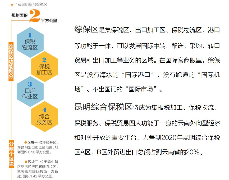 昆明將利用綜合保稅區(qū)這一特有的功能政策優(yōu)勢(shì),積極與世界“對(duì)話”,積極聯(lián)通國(guó)內(nèi)國(guó)外“兩個(gè)市場(chǎng)”和“兩種資源”,集聚各類高端生產(chǎn)要素,把昆明打造成為面向西南開(kāi)放的區(qū)域性國(guó)際貿(mào)易中心、物流樞紐中心、金融中心、信息中心、總部聚集中心、旅游文化中心和開(kāi)放平臺(tái),進(jìn)一步增強(qiáng)昆明面向南亞?wèn)|南亞的影響力、輻射力、帶動(dòng)力。